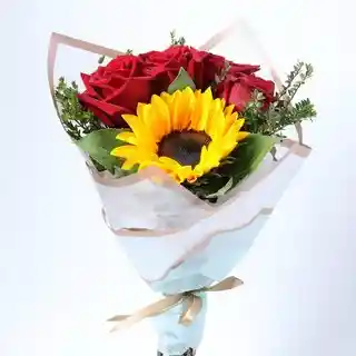 ¡La combinación perfecta entre pasión y alegría! Exclusivo bouquet "Per Te" que fusiona la elegancia de 4 rosas rojas importadas con la vitalidad de 1 girasol radiante, creando un mensaje de amor apasionado y felicidad pura. Características: 4 rosas rojas importadas premium 1 girasol fresco y vibrante Follaje verde decorativo natural Papel empavonado elegante en tonos suaves Cinta satín como toque de distinción Presentación sofisticada y romántica Perfecto para: Cumpleaños especiales Declaraciones de amor únicas Aniversarios memorables Sorpresas románticas Expresar "eres mi sol y mi pasión" Entrega el mismo día en Región Metropolitana Flores importadas y locales de máxima calidad y frescura. Las rosas rojas simbolizan amor profundo, mientras el girasol representa alegría y devoción. ¡Un mensaje completo de amor! 🌹 Rosas importadas premium 🌻 Contraste perfecto de colores 🎀 Presentación de lujo 🚚 Entrega rápida garantizada