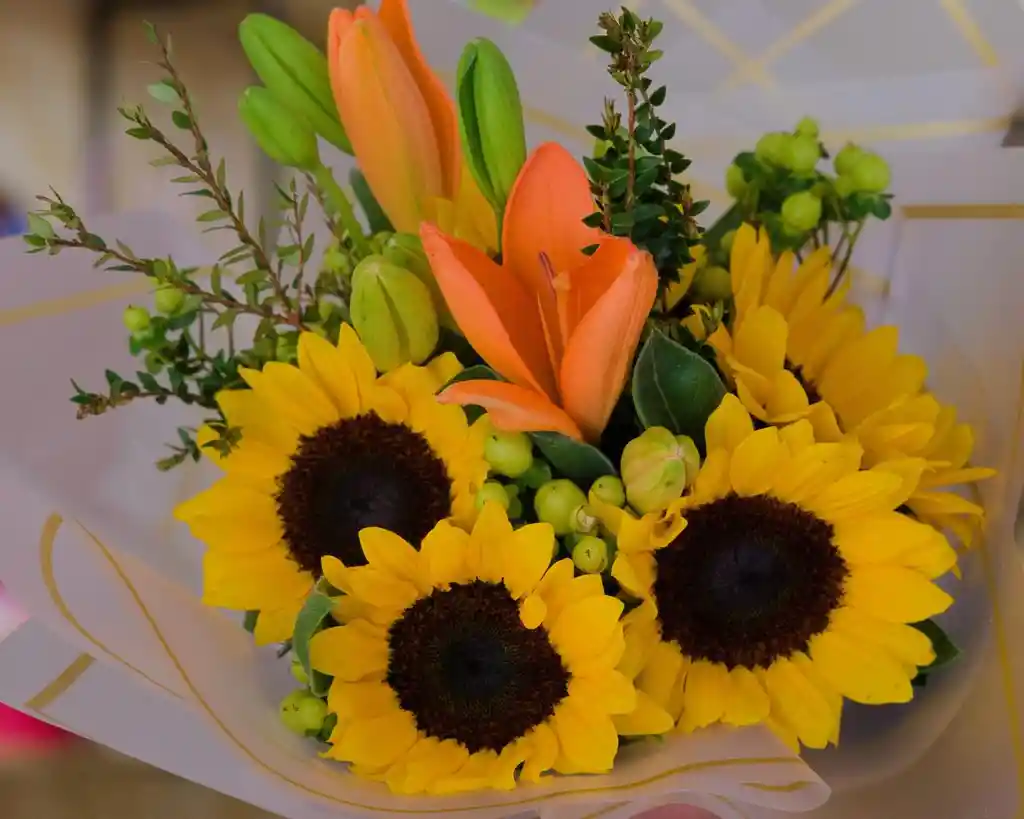 Girasoles y Lirios acompañado con Hypericum y follaje verde, envuelto en papel coreano y un lazo