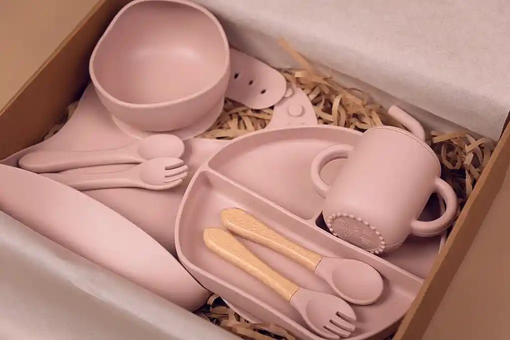 Box de alimentación de silicona, incluye, plato con succión, Bowl con succión, Vaso con bombilla, 2 cucharas, 2 tenedores, babero. Viene listo para regalar.