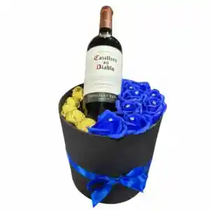 Box Cilindro de 9 Rosas Azules Eternas, 6 Bombones y Botella de Vino