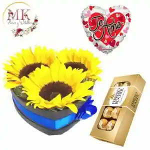 Box Corazón de 3 Girasoles, Bombones Ferrero Rocher 100grs y Globo