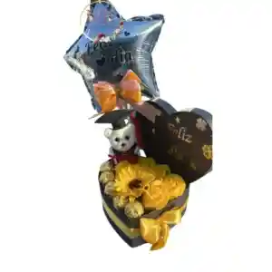 Box Corazón de Graduación con Rosas y Girasol Eterno con Bombones y Globito