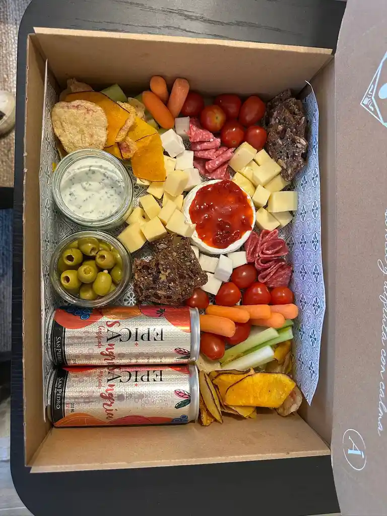 Caja de picoteo premium que contiene: 2 sangrías épica, queso gruyere, mantecoso y de cabra. Queso camembert con mermelada de pimentón Salame Salsa de ciboullette Tomates cherry, apio y zanahorias baby Aceitunas rellenas Papas fritas nativas Tostadas artesanales