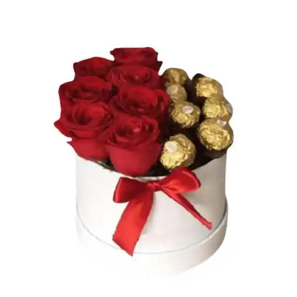 Box de 7 rosas, 7 bombones ferreros rocher y lazo