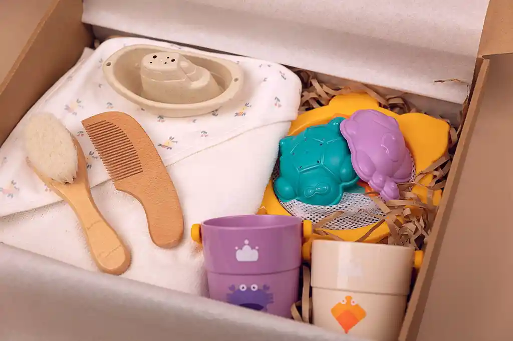Box de baño, pensada para hacer de este momento una experiencia más entretenida. Viene lista para regalar Incluye: - Toalla - Peinetas de madera - Juego de pesca para la tina - 2 Baldecitos con orificios para ver el agua caer - 1 Botecito para jugar o enjuagar - 1 Corta uña - 1 dedal de silicona