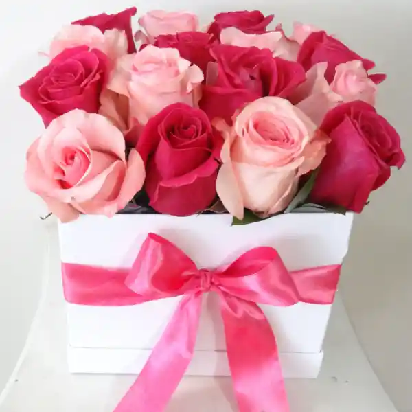 Elegante y fina caja de 12 rosas de colores mixtos. Imagen referencial