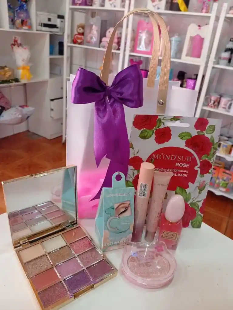 Kit incluye: Mascarilla facial Paleta de sombra con espejo Labial Balsamo labial Esmalte de uñas Iluminador Delideador de ojos