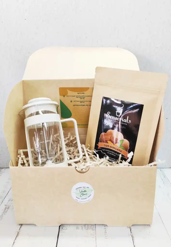 Este Box está pensado para aquellos que disfrutan de una tradicional preparación en prensa francesa. Incluye una prensa francesa, para muchos “la mejor manera para preparar el café”, junto con el café favorito de muchos, café de grano molido, mezcla arábica de altura con avellana, una experiencia exclusiva! Incluye: 👉 Café de grano molido, Mezcla arábica de altura con avellana. 100 gr 👉 Cafetera francesa oh lala. 360 ml 🎁 En especial box para regalo 🎁