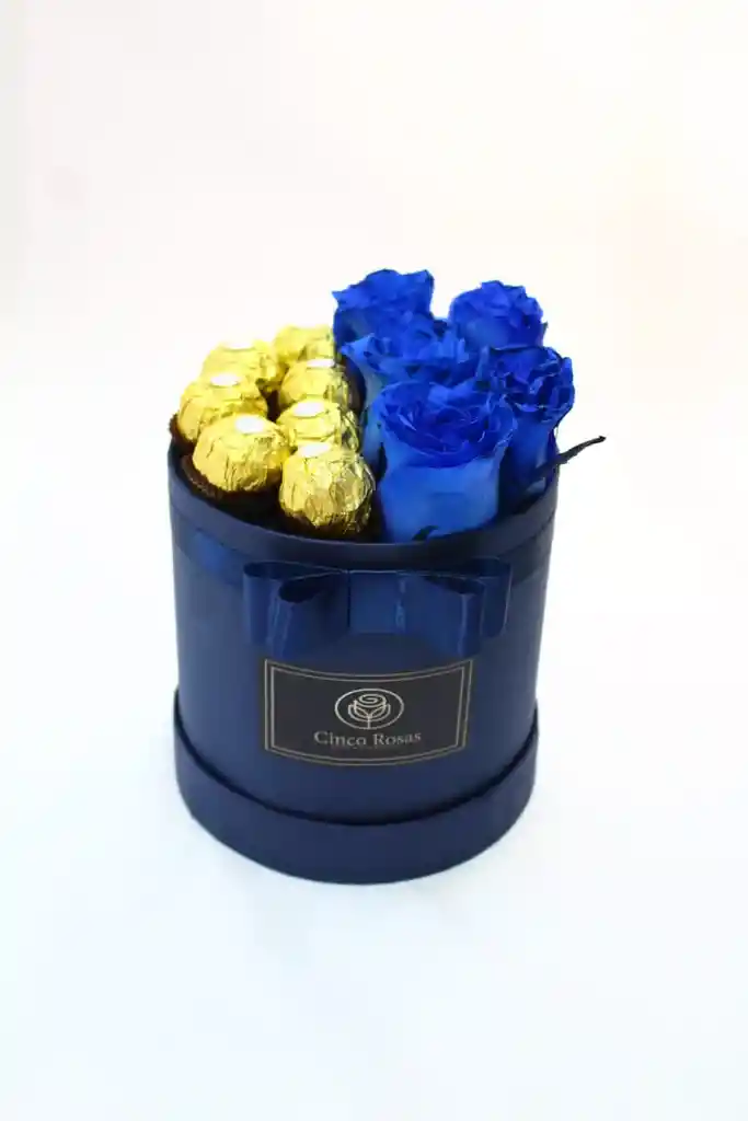 Box - Caja cilíndrica en color blanco o azul oscuro mitad rosas azules naturales y mitad bombones Ferrero Rocher.