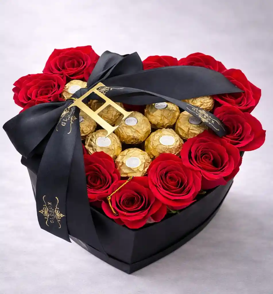 Caja corazón con 13 rosas naturales importadas mas 10 bombones ferrero rocher, con lazo y corazón acrílico de nuestra marca.