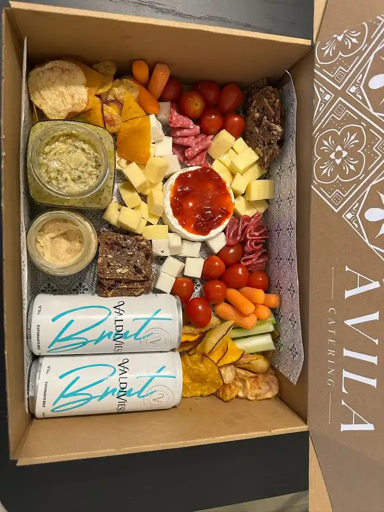 Caja de picoteo premium que contiene: 2 espumante brut Queso gruyere, mantecoso y de cabra Queso camembert con mermelada de pimentón Salame Hummus Tonates cherry, apio y zanahorias baby Bruschetta de alcachofa Papas fritas nativas Tostadas artesanales