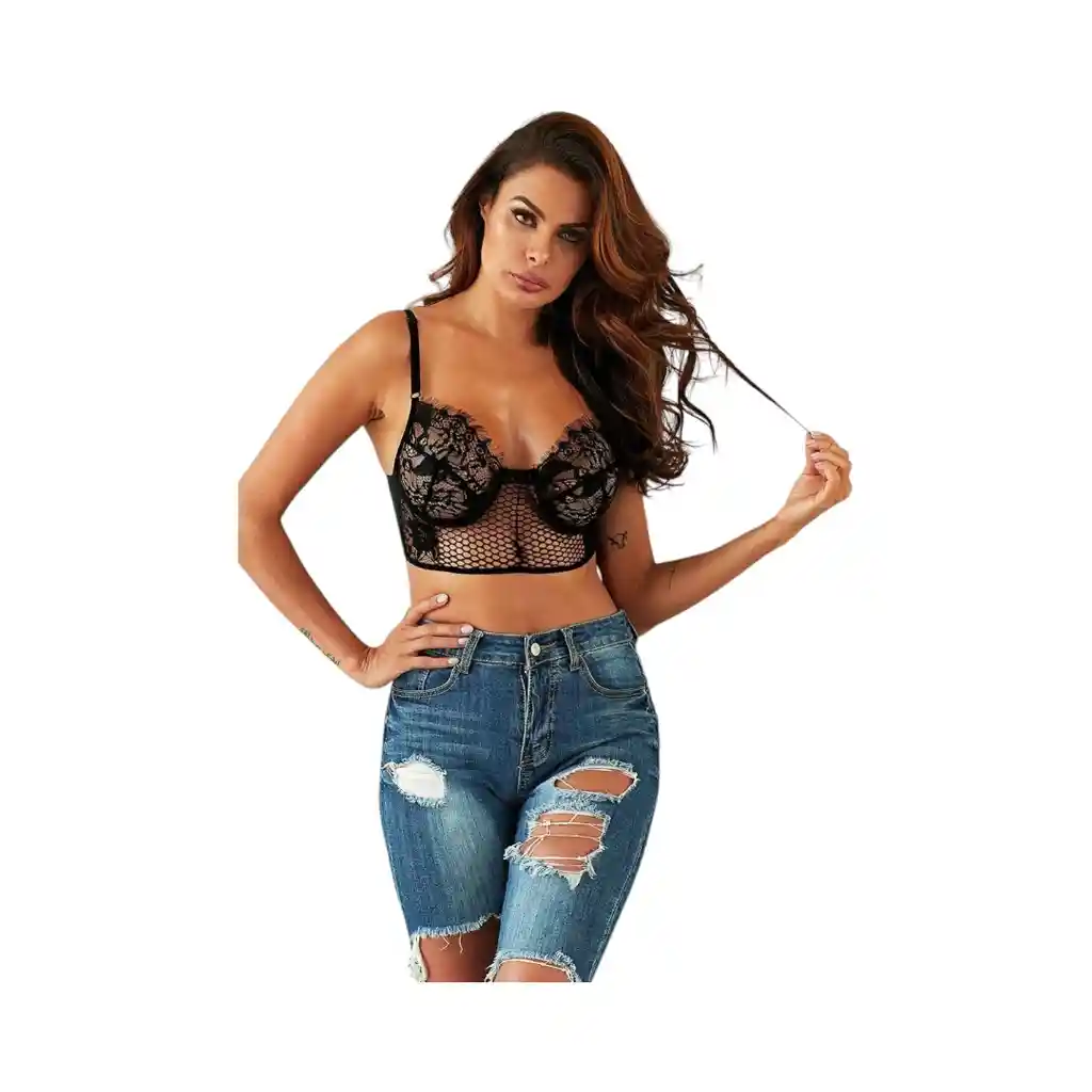 Pandora es un seductor bralette de encaje y malla transparente con tirantes de hombro ajustables. Pandora mezcla lo firme de un sostén de copa (contiene barba) y lo cómodo de un bralette cerrado. Puedes usarlo como un lindo top sensual o lencería para días especiales. Características: Color: Negro. Talla: M. Sin forro. Con barba metálica. Tirantes ajustables de hombro. Material: 95% Poliéster y 5% Spandex. Medidas: Ancho contorno: 70 cm. Observaciones: Recomendamos lavar tu producto a mano para cuidar su vida útil, escurrir suavemente sin estrujar para evitar estropear el tejido. No planchar, no lavar en seco. ¡ATENCIÓN! Por motivos de higiene y seguridad, y dado que se trata de un producto de uso personal e íntimo, no se realizan cambios ni devoluciones de nuestra lencería erótica. Te recomendamos revisar detalladamente las tallas, medidas y características antes de realizar tu compra para asegurar la mejor elección.