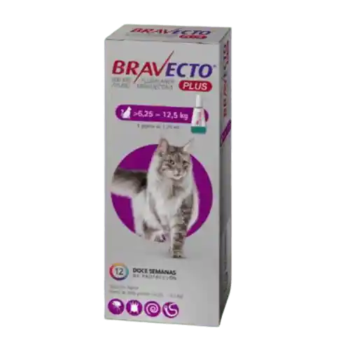 El Bravecto® Plus es un antiparasitario interno y externo para gatos. Es una solución tópica de fácil aplicación para infestaciones parasitarias mixtas por pulgas y nematodos intestinales (larvas de 4to estado, adultos inmaduros y adultos de Toxocara cati y Ancylostoma tubaeforme). Composición: Fluralaner 500 mg – Moxidectina 25 mg.