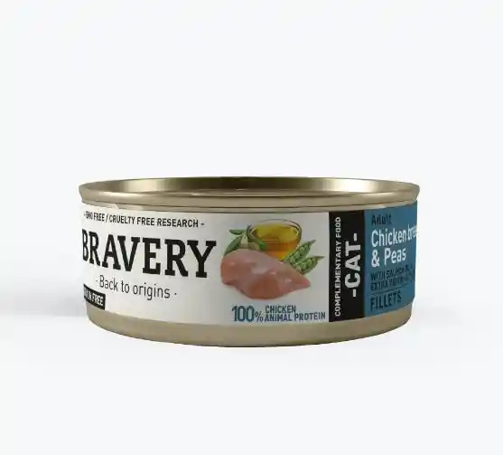 El Bravery Lata Chicken Breast and Peast Adult Cat 70gr es un alimento húmedo complementario para gatitos. Elaborado con pollo y guisantes que aporta además de un alto contenido en proteínas, multitud de vitaminas y minerales(betacarotenos). Además aporta un alto contenido de nutrientes que son beneficiosos para la salud del organismo y facilita la digestión.