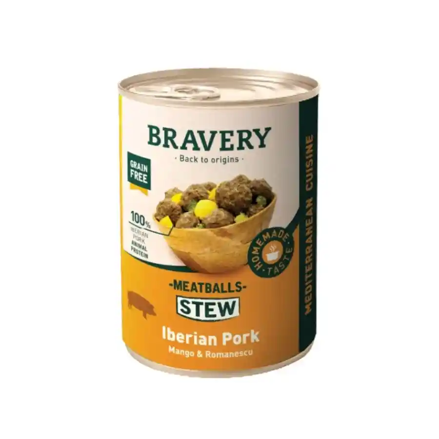 Las albóndigas caseras de Bravery están hechas con carne de cerdo ibérico deshuesada (+70%) como única fuente de proteína animal, frutas frescas, algarroba y tapioca.