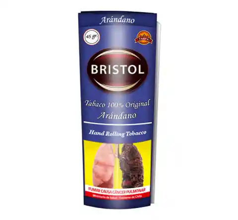 El Tabaco Bristol Arándano es tabaco 100% natural de corte fino, fabricado en Brasil y envasado en Chile, que combina tabacos Virginia, Burley y Oriental con un distintivo sabor y aroma frutal y dulce a arándano. Se presenta en un práctico paquete de alusa con cierre zipper de 45 gramos, ideal para mantener su frescura, y es una opción suave y de combustión lenta.