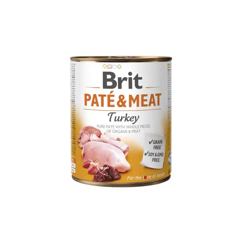 Brit Care Pate Meat Turkey 800 G es un alimento enlatado para perros no contiene granos, GMO ni soya. es un alimento completo para perros adultos. Contiene verdaderos trozos de carne con pedazos enteros de menudencias en paté.