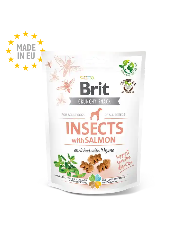 Descubre 'Insects with Salmon' de Brit Care, un snack funcional con proteínas de insectos y salmón. Estos huesos crujientes fortalecen el sistema inmunológico y ofrecen un placer gustativo irresistible.