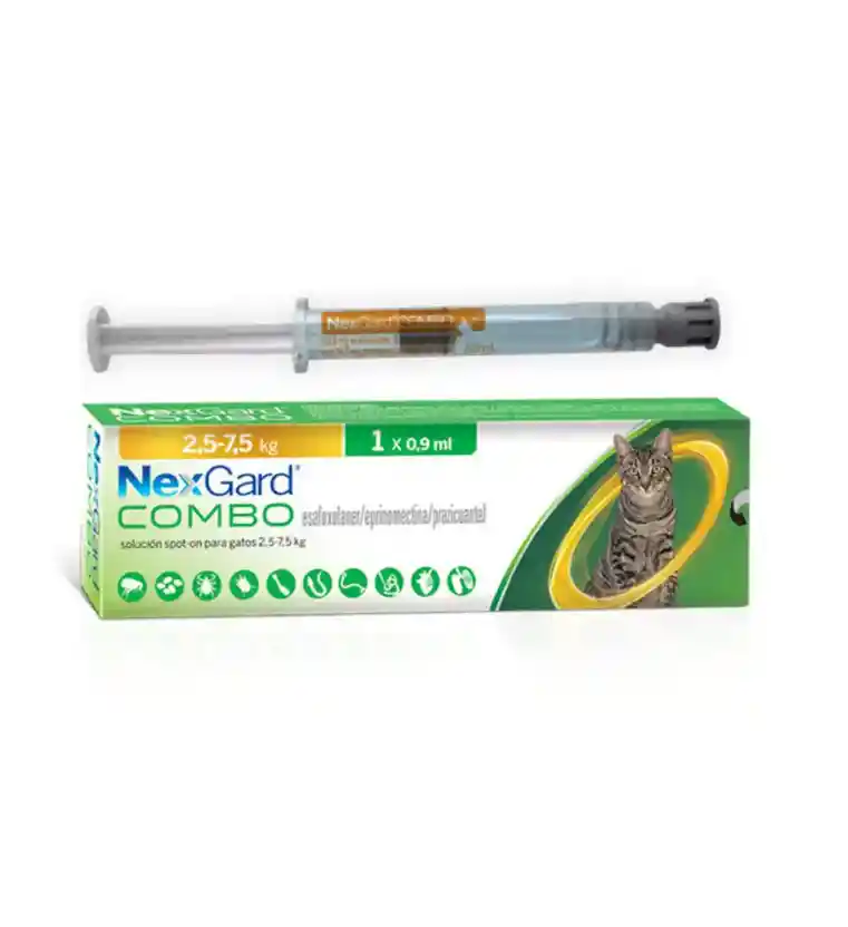 Broadline/NexGard Combo Antes llamado Broadline cubre un amplio espectro de parásitos externos e internos, incluyendo pulgas, garrapatas, gusanos del corazón y gusanos intestinales. Además, NexGard Combo previene la dirofilariosis felina y es seguro de usar durante las épocas de gestación y lactancia, proporcionando una protección integral para tu mascota en todas las etapas de su vida. Descripción Nexgard® COMBO es una pipeta diseñada para gatos de uso exclusivo tópico que incorpora un cómodo aplicador que les brinda protección contra pulgas, huevos de pulgas, garrapatas, ácaros y parásitos internos de los gatos. Debe aplicarse en áreas donde hay Dirofilaria (gusano del corazón) mensualmente durante todo el año en áreas donde aparecen las garrapatas paralíticas. Para más información consulta a tu Médico Veterinario. Composición Son 3 los ingredientes activos de Nexgard COMBO: Esafoxolaner, Eprinomectina y Praziquantel.