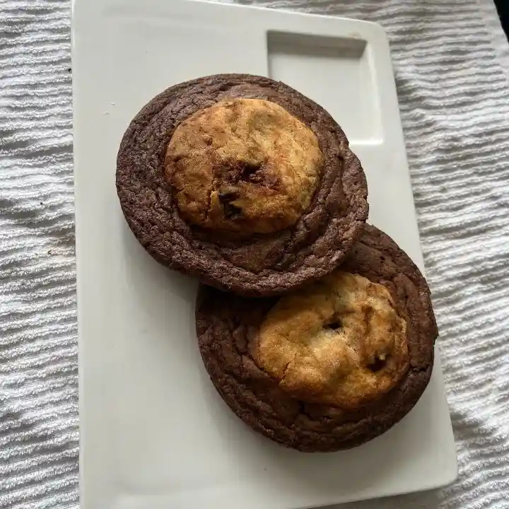 Un bocado, dos mundos: base de brownie intenso y húmedo, con una isla cookie de nuez caramelizada, crujiente y dorada. Puro placer artesanal.
