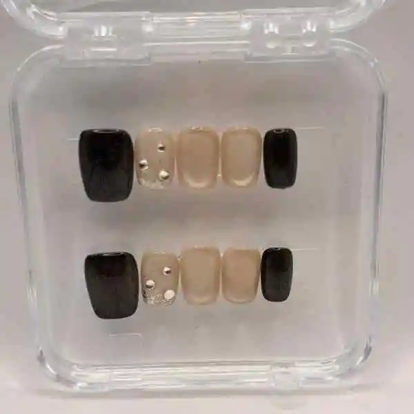 Uñas hechas a mano en color marrón y beige, con finos detalles de piedras. Ojo de gato. Forma: Cuadrada, Talla: M Kit Incluye: 10 uñas, 24 stickers, lima, palo de cuticula, alcohol pad. 100% veganas, libres de crueldad animal, listas en 10min y duran hasta 2 semanas.