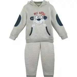 Buzo de dos piezas. Color Gris con aplicación de perrito. 65% algodón, 35% Poliéster. Polerón con capucha y bolsillo frontal. Pantalón  a rayas con cordón en la pretina. Cómodo y versátil.