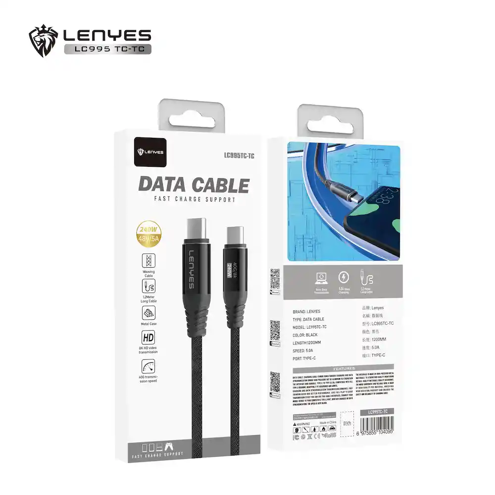 CABLE TIPO C A TIPO C Caja de aluminio negra + Cable trenzado negro de 1,2 m Parámetros 240W, 48V-5A, 8K. Carcasa TIPO C: Carcasa de aluminio con borde de alto brillo Cubierta exterior trenzada gris-negra OD: 4,0 6 núcleos (105/0.08BC+250D)*2C+(16/0.08BC+250D