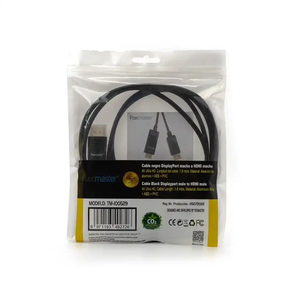 Cable Display Port a HDMI 1.8mts. Display Port macho a cable HDMI macho, material de ABS con Nucleo de alambre de cobre puro, OD5.0. Soporta una resolucion de hasta 4K@30Hz, posee una longitud de 1,8 mts. Color negro