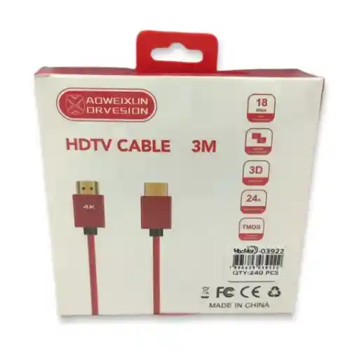 SOMOS MIKI IMPORTS Cable HDMI 4K De 3 Metros, Versión 1.4 Cable HDMI versión 1.4, 4K marca Aoweixun Orvesion, cuenta con 3 metros de longitud y cable reforzado con fibra textil CARACTERISTICAS: - Cable audio - video - Full HD - Imagen en 3D - 18 Gbps - Admite resolución 480i, 480p, 720p, 1080i, 1080p, 4K. - Tercelete imagen - Disfruta de imagen y audio HD. - Tapas de protección en policarbonato. - Longitud 3 metros CARACTERISTICAS: - Cable audio - video - Full HD - Imagen en 3D - 18 Gbps - Admite resolución 480i, 480p, 720p, 1080i, 1080p, 4K. - Tercelete imagen - Disfruta de imagen y audio HD. - Tapas de protección en policarbonato. - Longitud 3 metros