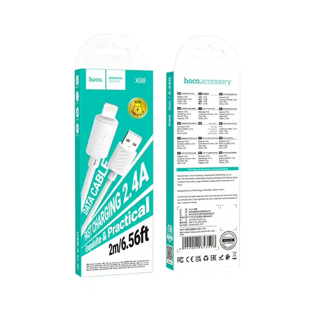 El Hoco X88 Gratified Lightning de 2 metros es perfecto si necesitas más alcance para cargar tu iPhone o iPad con comodidad, ya sea en la cama, escritorio, auto o mientras trabajas. Su largo extra te permite usar el teléfono sin quedar pegado al enchufe. Diseñado para carga y transferencia de datos, es una excelente opción como cable principal o de respaldo para el día a día. Compatible con dispositivos Apple con puerto Lightning, como iPhone y iPad (según modelo), ofreciendo una conexión estable y práctica para cargar, sincronizar y respaldar información.