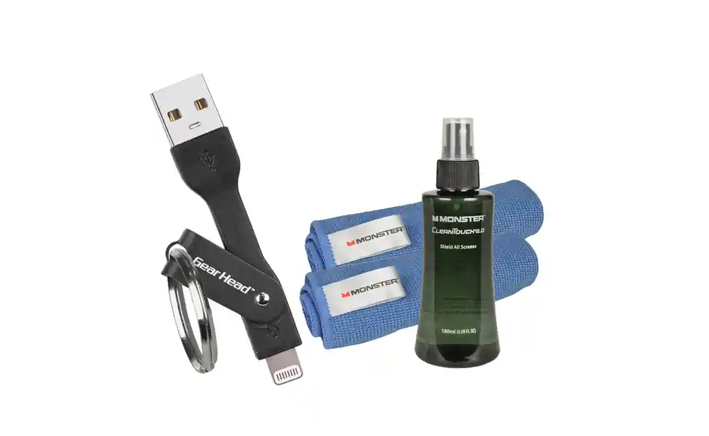 Descripción cable: Compatible con dispositivos Apple Compacto y versátil Cable de carga USB, sincronización y transferencia de datos Especificaciones: Marca: Gear Head Material: silicon flexible Certificación Apple MFi tipo llavero Descripción Kit limpiador: Solución sin alcohol y sin amoníaco elimina de forma segura las bacterias, el polvo, la suciedad y las huellas dactilares del smartphone, pantallas de Tablet (ipad) y dispositivos electrónicos portátiles. • Botella pulverizadora de bomba • Solución sin alcohol y sin amoníaco • El polímero especial ayuda a proteger las superficies sin goteos, rayas ni manchas. • Incluye dos (2) toallas de microfibra Monster