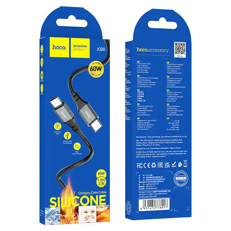 Cable Hoco X86 Tipo-C a Tipo-C 60W – Potencia y Versatilidad El Hoco X86 es más que un simple cable: es la herramienta que necesitas para maximizar el rendimiento de tus dispositivos. Con capacidad de carga rápida de hasta 60W, este cable es ideal para laptops, smartphones y otros dispositivos con conexión Tipo-C, garantizando una carga estable y segura en todo momento. Fabricado con silicona flexible de alta calidad y conectores de aleación de aluminio, el Hoco X86 ofrece resistencia al desgaste diario y una larga vida útil. Su núcleo reforzado asegura una transferencia eficiente de energía y datos, mientras su longitud de 1 metro brinda la libertad y comodidad necesarias para cualquier entorno. Características destacadas: Carga rápida 60W: Soporta 20V/3A para laptops y 3A para móviles. Material premium: Silicona resistente y conectores de aluminio duraderos. Longitud práctica: 1 metro, ideal para casa, oficina o viaje. Compatibilidad universal: Compatible con marcas como Samsung, Xiaomi, Huawei y más. Diseño robusto: Perfecto para un uso prolongado sin comprometer el rendimiento. El cable Hoco X86 combina diseño, funcionalidad y durabilidad en un accesorio imprescindible para cargar y sincronizar tus dispositivos con rapidez y estilo. ¡Hazlo parte de tu día a día!