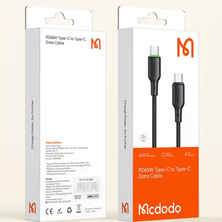 Marca MCdodo Modelo CA-477 Tipo C a Tipo C Tecnología Inteligente Power Delibery Carga Súper rápida hasta 65W y 3.25A longitud 1.2 metros Tecnología de silicona liquida que evita que el cable se ensucie Con led indicador Alta calidad ideal para carga Macbook y laptops de diferentes marcas asi como celulares. Producto en Caja