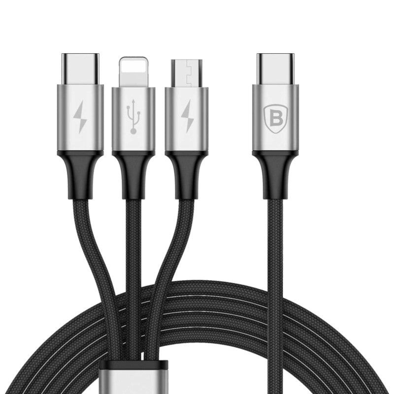 Corriente: 5V3A (MAX) Material: aleación de aluminio + nailon trenzado Conectores: Lightning, Micro USB, Tipo C Longitud: cable principal de 1 metro, 0,2 cada rama