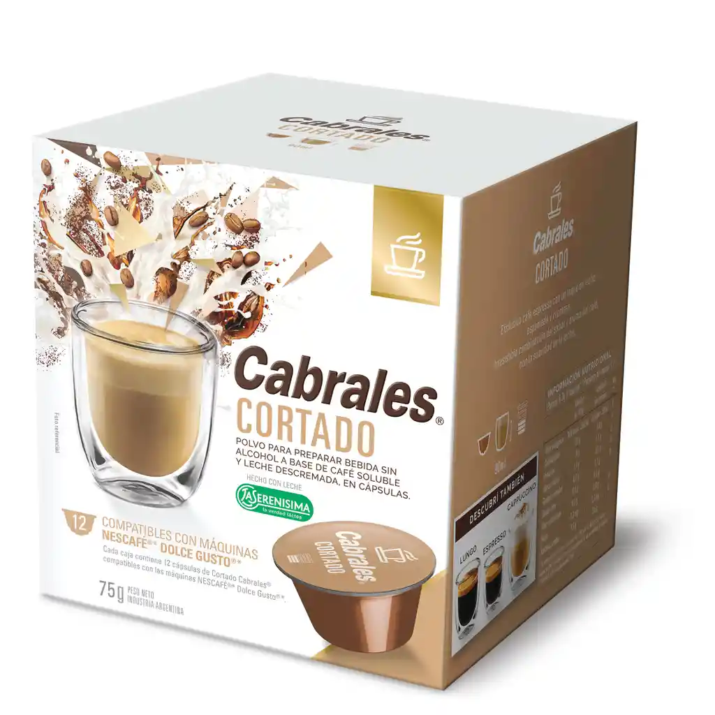 El café en cápsulas cabrales cortado es un polvo para preparar bebida sin alcohol a base de cafe soluble y leche descremada en capsulas. Compatible con maquinas nescafe dolce gusto. packing: Caja