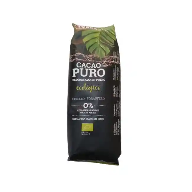 Cacao puro desgrasado en polvo. Ingredientes de producción ecológica. sin gluten, sin azúcar añadida