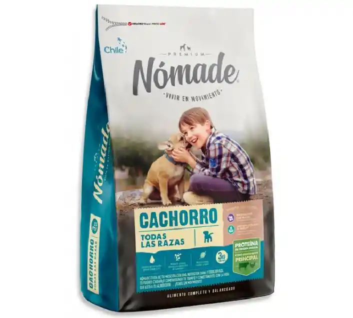 Nómade es un alimento para perros cachorros de todas las razas desarrollado por expertos en nutrición animal. Un alimento que excede los requerimientos nutricionales de los cachorros, para lograr un desarrollo al máximo de su potencial genético, proporcionando una dieta sana y equilibrada para una vida plena, feliz y en movimiento.