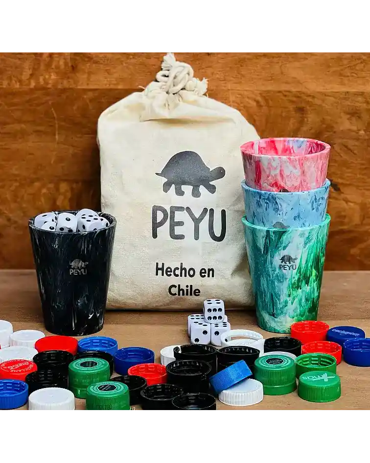 PACK 4 CACHOS 100% reciclados, saco de algodón orgánico y 20 dados. JUEGA DONDE QUIERAS.
