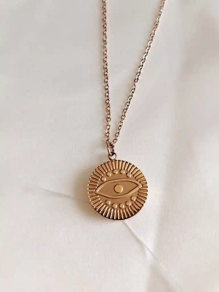 Cadena color oro rosa con dije de ojo, inspirada en la protección y la energía positiva. Diseño delicado, cómodo y fácil de combinar para el día a día.