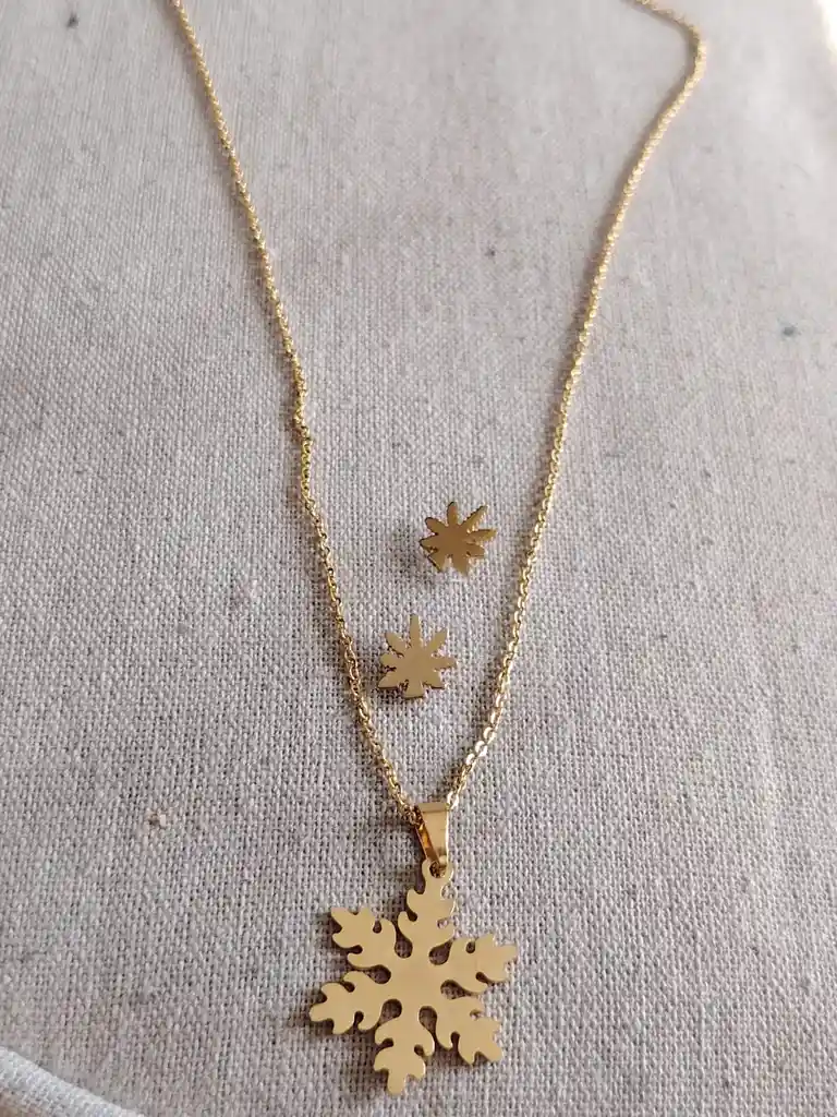 Set de cadena y aretes con diseño de copo de nieve, bañados en oro. Delicado y elegante, ideal para uso diario o regalo