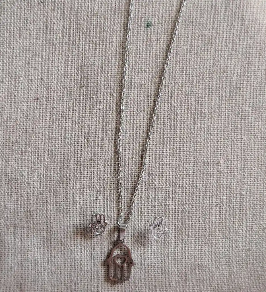 Set de cadena y aretes plateados con diseño de mano protectora y corazón, ideal para uso diario o regalar.