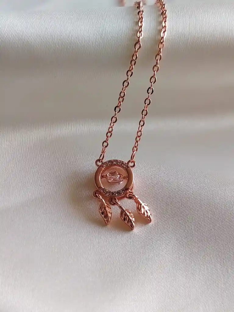 Cadena de diseño fino con dije estilo atrapasueños, detalle circular con brillo central y hojitas colgantes que aportan movimiento y un toque femenino. Ideal para uso diario y para sumar un estilo delicado y simbólico a cualquier look.