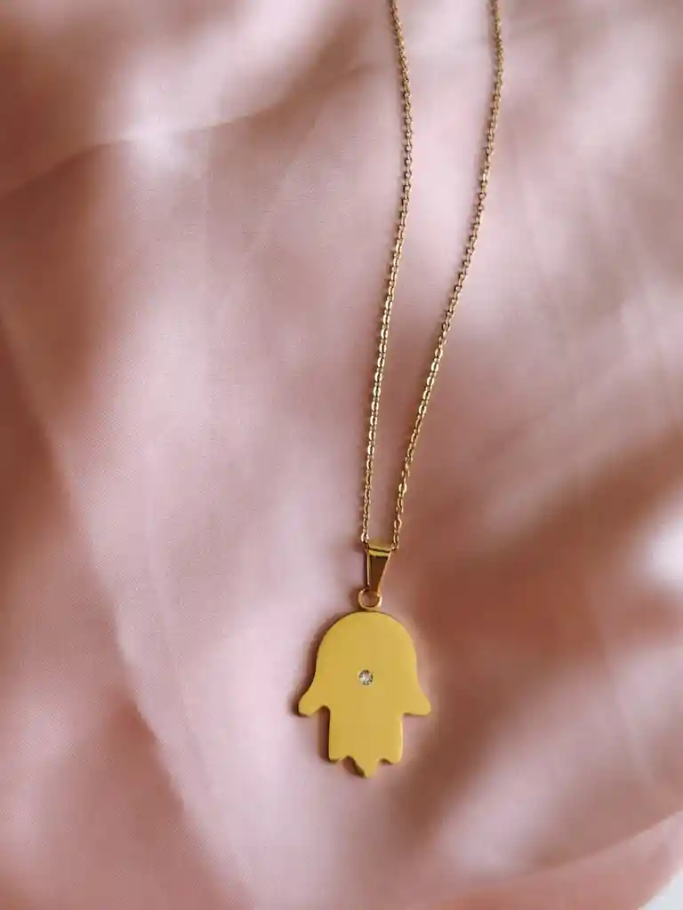 Cadena bañada en oro con delicado dije de Mano de Fátima (Hamsa) y punto de luz central. Diseño minimalista y elegante, ideal para uso diario y para atraer protección y energía positiva.
