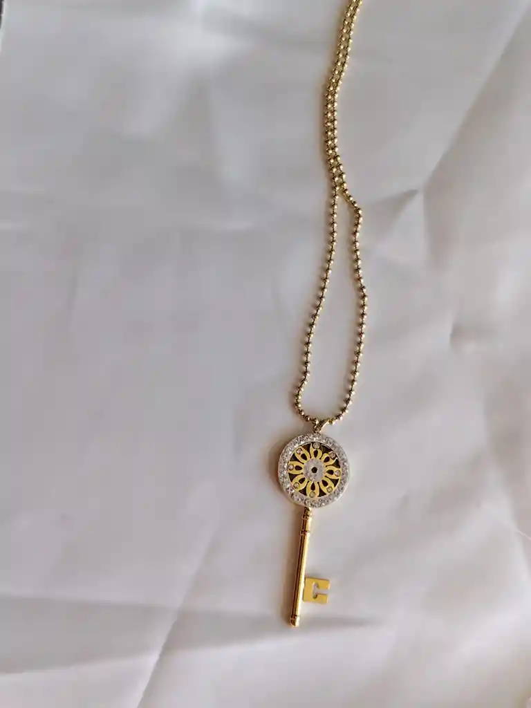 Cadena bañada en oro con dije de llave y detalles brillantes. Diseño moderno que aporta un toque especial y sofisticado a cualquier outfit