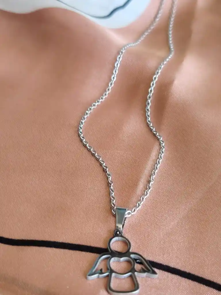 Cadena bañada en plata con dije de ángel de diseño minimal y corazón central. Delicada, simbólica y perfecta para llevar protección y estilo todos los días.