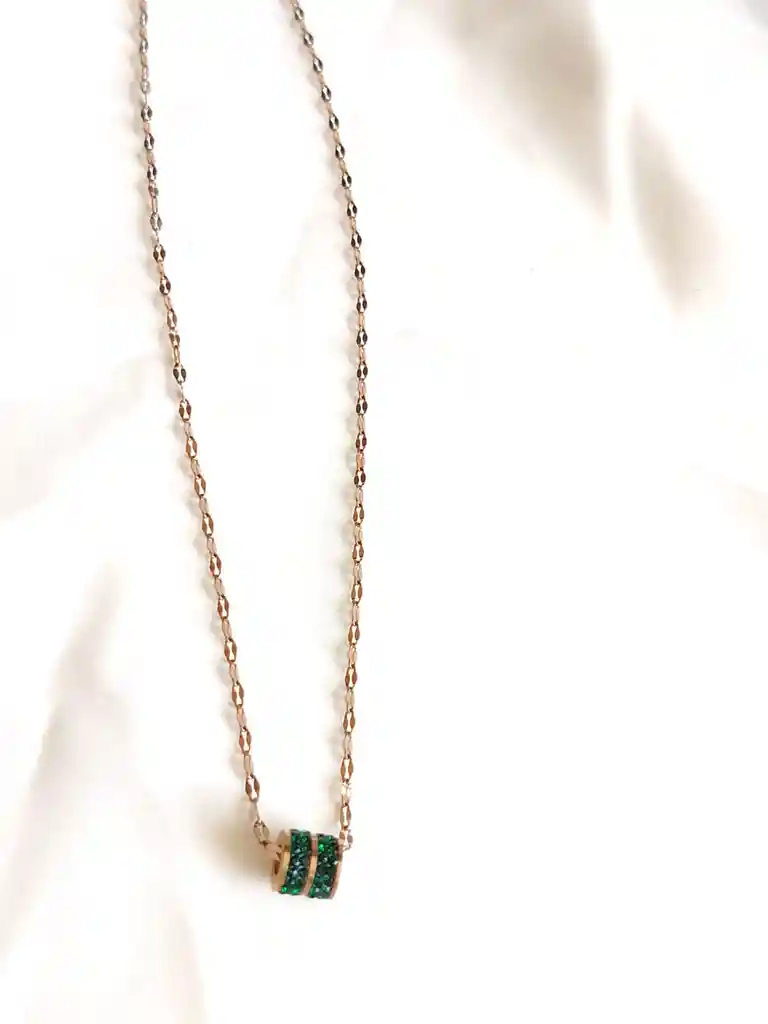 Cadena de diseño delicado con charm cilíndrico decorado con brillantes verdes, de acabado pulido y estilo moderno. Ideal para uso diario y para aportar un toque de color elegante y sutil.