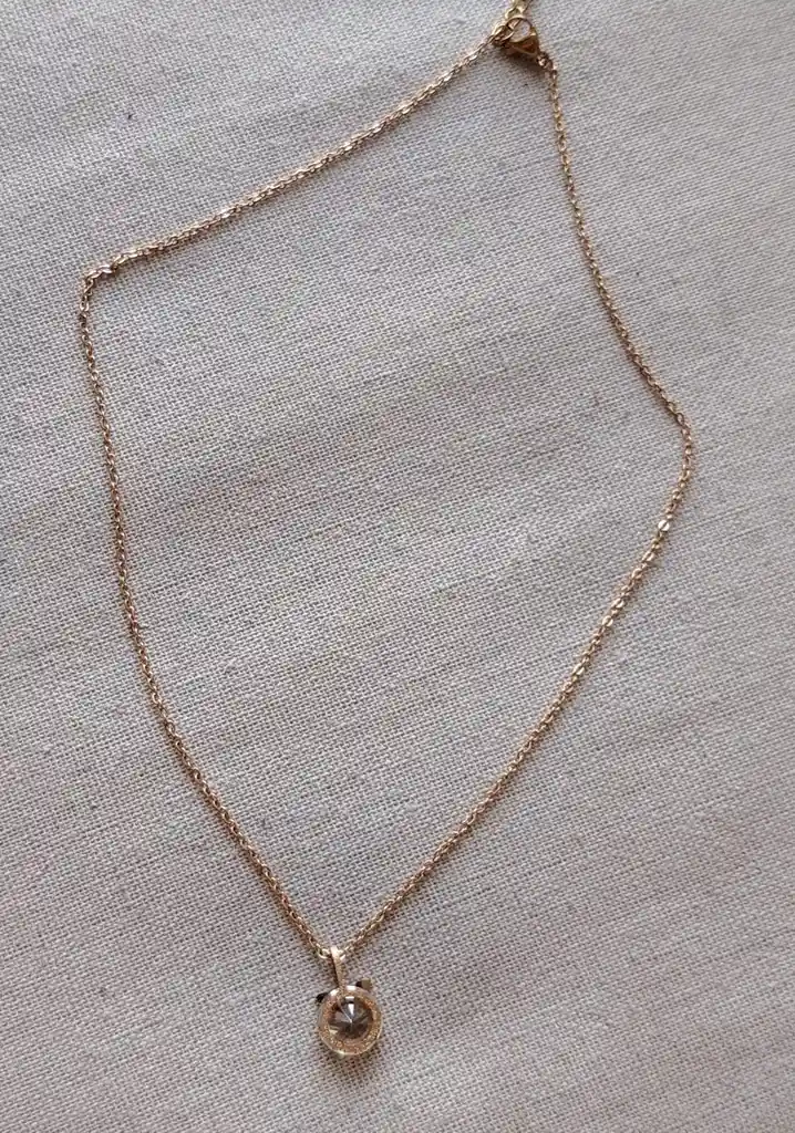 Cadena en tono oro rosa con dije de cristal facetado, elegante y luminoso, ideal para aportar un toque delicado y sofisticado a cualquier look.