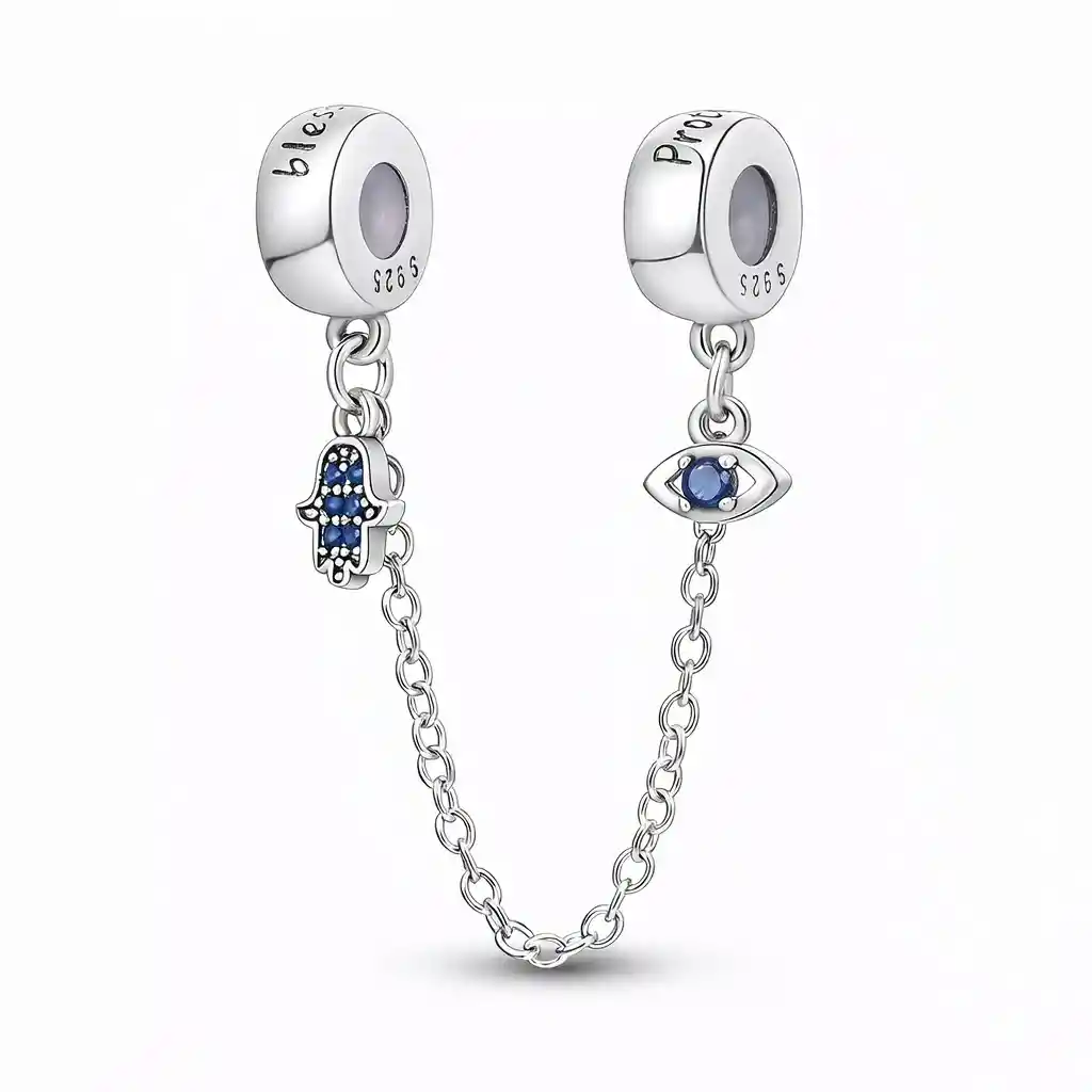 Protege tus charms y tu energía con esta cadena de seguridad en Plata 925, que une dos poderosos símbolos: la Mano de Fátima, asociada a la protección, equilibrio y buena fortuna, y el Ojo Turco, reconocido por resguardar contra las malas energías. Un diseño funcional y lleno de significado, ideal para mantener tus joyas seguras con un toque místico y elegante. Especificaciones: - Material: Plata Ley 925 - Presentación: incluye caja elegante, ideal para regalar. - Estilo: Elegante. Cuida tus joyas y tu energía. ¡Adquiérela ahora y completa tu pulsera con protección y estilo!