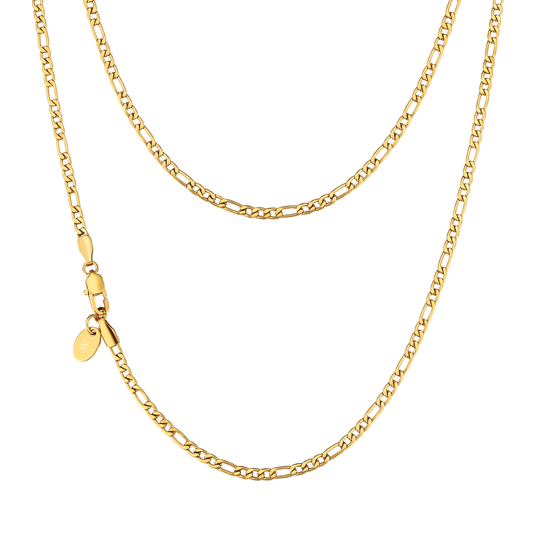 <p>La Cadena Fígaro de Saint Venik diseñada con el único y exclusivo patrón de eslabones con forma de tres círculos y un óvalo es la que te otorga un perfecto acompañamiento a tu vestuario de uso cotidiano.Características✓ Enchapado Oro 18k de 2.5 micras✓ Acero inoxidable 316L✓ Resistente al agua, sudor y calor✓ Hipoalergénico (sin piel verde)Grosor: 3mm.Tamaños: 50cm/60cm.</p>