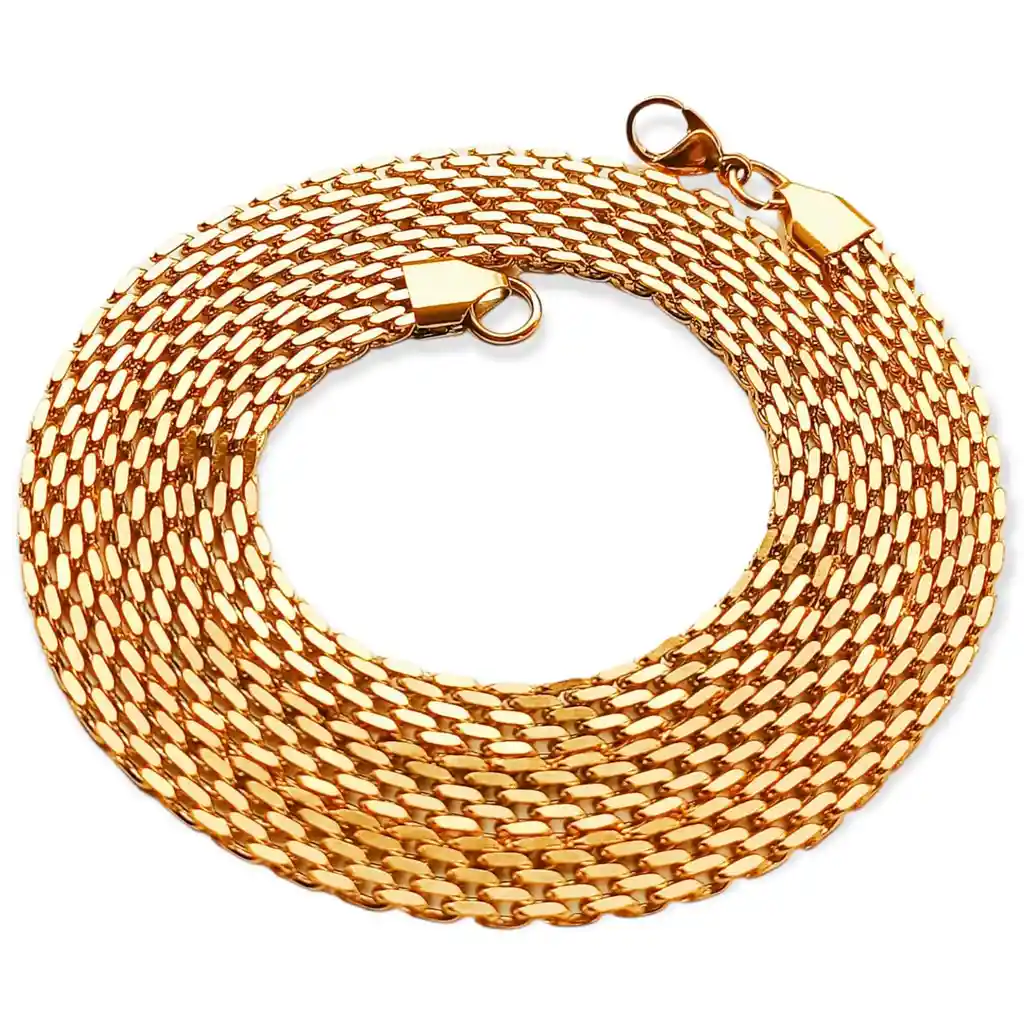 Cadena tejido plano de malla, estilo chunky. Con hermoso acabado chapado en oro 18k de excelente calidad y resistencia. Ideal para combinar con otros colgantes y crear un look bien edgy u optar por algo más minimalista. De igual forma, el collar es un total acierto que complementara cualquier atuendo. Material: Hipoalergénico, chapado en oro 18k. Peso aprox 17 g Dimensiones: 55 cm x 6 mm (Se envía con bella caja de regalo) Ofrecemos joyas únicas, que cuentan historias especiales. Contamos con una amplia variedad de joyas de metales preciosos, gemas y arte adaptados a los gustos de nuestros clientes. Además, ofrecemos auténticas piedras preciosas de la mejor calidad. Descubre nuestros productos en plata, oro, oro rosa y acero quirúrgico 316L, perfectos para cualquier ocasión. Encuentra el regalo u obsequio perfecto para navidad, dia de reyes, cumpleaños, San Valentín, aniversario, día de las madres, día del padre, graduaciones, bodas, obsequios para niñas, niños, para dama, caballeros, viajeros y más. ¡Regalos originales y obsequios para todo tipo de fanáticos y amantes de la vida!